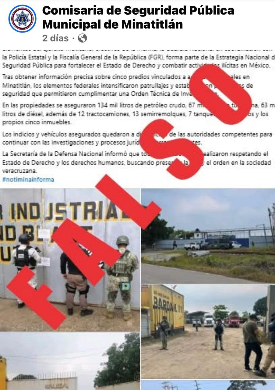 Nos llama la atención el hecho de que la página de la Comisaría de Seguridad Pública Municipal de Minatitlán haya calificado como FALSA la información que circulaba en redes sociales, sitios digitales y medios informativos nacional del operativo que se llevó a cabo en esta ciudad, donde se logró asegurar más de 260 mil litros de hidrocarburos en cinco inmuebles que fueron cateados por elementos de las fuerzas federales.